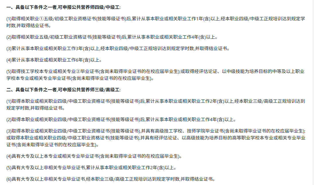 ◉条件 1:本专业或相关专业大专及以上学历毕业生,持有营养师或相关职业三级职业资格证书(技能等级证书),且累计从事本职业或相关职业工作满 1 年(含)。