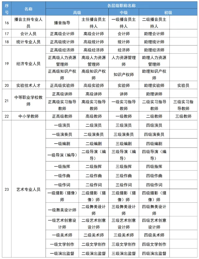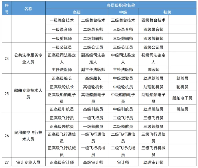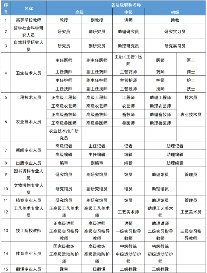 现阶段,我国职称共设置27个系列:高等学校教师(高校、高职、党校、电大)、中等职业学校教师、技工院校教师、中小学教师、自然科学研究人员、社会科学研究人员、实验技术人员、卫生人员、工程技术人员、农业技术人员、经济、统计、会计、审计、新闻、出版、播音主持、艺术(文学创作)、图书资料、文物博物(群众文化)、翻译、体育、档案、工艺美术、公共法律服务人员(司法鉴定、公证)、民用航空飞行、船舶。